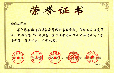 总裁李成功先生当选为中国力量第七届中国时代十大诚信人物