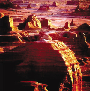 将军戈壁是个奇特而怪异的地方,初次走进就被它独有的景象震惊了。这里的一切都是无法预料的,不论在来之前曾幻想过多少次它的模样,当站在这片戈壁向远处眺望时,还是会发现人类是多么渺小。站在这样碧蓝的伸手可触的天空下,望着远处如同正在燃烧着的山脉,不禁要问:这一切难道是真实的吗?或许还会隐约看见那位误入迷途的将军,在夕阳下骑着一匹消瘦的战马,挥舞着长枪,奔驰在戈壁之上。