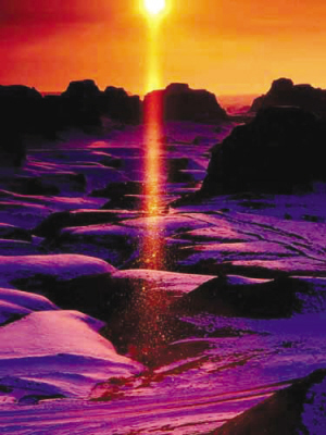 戈壁上没有高大的树木可以乘凉,没有饭菜可供充饥,更没有水源能够解渴,唐军一时间陷入了绝境。正在此时突然发现前方有一潭碧水,湖边杨柳摇曳,屋舍成排,将军和士兵便拼命地朝着湖水奔跑而去。可是他们跑得越快水也就远去得越快,湖水瞬间消失了,面前仍旧是炽热的戈壁,将士们正在悲痛,突然前方又出现了一潭湖水,鳞波荡漾,将士们再度狂奔。