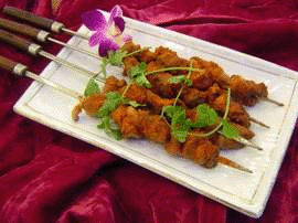 烤羊肉串是将肉切成薄片,一一穿在铁钎子上,然后均匀地排放在烤肉炉上,撒上精盐、孜然和辣椒面,上下翻烤数分钟即可食用。味道微辣中带着鲜香,不腻不膻,肉嫩可口。过去,做烤肉串用的钎子都是用红柳的细条截削而成的木钎。现在,这种原始的木钎很难看到了。这种肉食不仅深受新疆各族群众喜爱,也深受关内一些地区汉族群众欢迎,现在关内很多地区都有烤羊肉串了,可以说烤羊肉串以它独特的风味成为风靡全国的一种小吃。