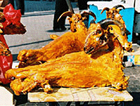 在新疆与北京烤鸭媲美的名贵菜肴就是烤全羊,是维吾尔族的一大传统名肴。在乌鲁木齐、喀什、和田等地的巴扎尔都可闻到它特有的香味。烤全羊不仅是街头的风味小吃,而且也是维吾尔人招待贵客的上等佳肴,现在也成为高级筵席中的