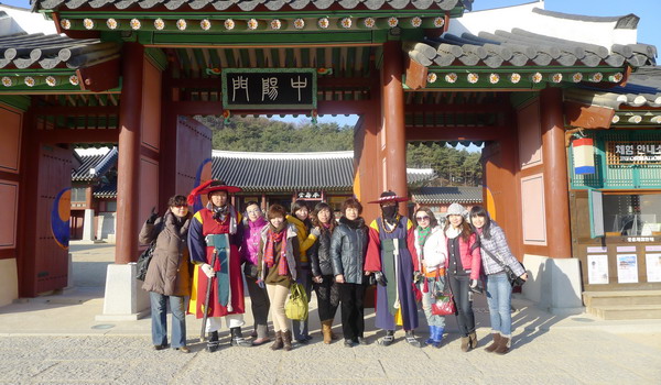 赴水源,游韩国民俗村,观《大长今》拍摄点,还与身着古装的保安留个影。