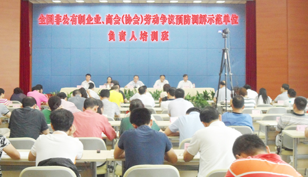 国家高度重视示范工作的进行,由国家人力资源社会保障部、人事司、调解仲裁管理司和中华全国工商联,共同组织对被确定为全国劳动争议预防调解示范单位的负责人进行集中培训。人社部仲裁管理司、全国工商联、全国总工会、上海财经大学法学院、中国人大劳动人事学院教授、上海市人社部仲裁院院长等领导和专家,从不同角度解读了在新形势下预防劳动争议的思路和主要任务及有关政策、法律知识、疑难案件的评析、劳资的协商等有关劳动关系、劳动争议的理论知识,以保障示范工作的有效开展。