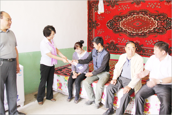 在少数民族传统节日肉孜节即将到来前的8月4日-5日,为使新疆华春投资集团下属的华春毛纺公司穆斯林员工和五家渠农六师少数民族贫困牧民能够过上一个愉快、祥和的节日,华春集团工会主席高青和集团人力资源部部长胡梅、集团下属的华春毛纺公司总经理助理白宝兵及集团编网部汪刚等一行4人组成的慰问组,代表李成功总裁和华春全员,与五家渠师市主管经济和劳动就业的有关领导一同来到北塔山牧场,亲切看望了在五家渠华春毛纺工业园工作的哈萨克族员工的家庭,同时,对北塔山牧场十多个困难牧民家庭进行了慰问,并为每户送去500元的慰问金,献上华春集团的一份心意。