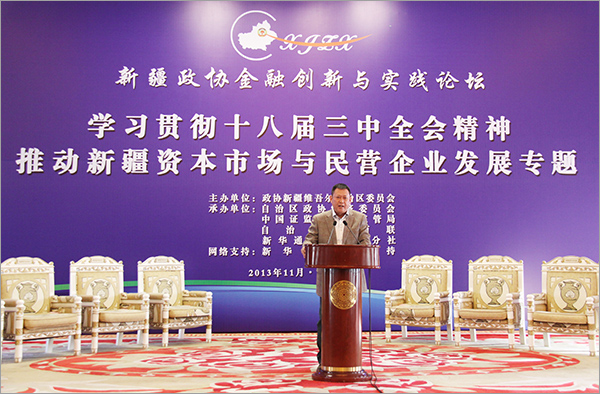 在举世瞩目的党的十八届三中全会刚刚闭幕之际,新疆政协金融创新与实践第二次论坛于11月15日在昆仑宾馆隆重召开。自治区政协主席努尔兰•阿不都满金讲话,自治区党政各部门领导与金融界保险及主要企业的代表约250人参会。自治区政协常委、新疆华春投资集团李成功总裁做了题为《进一步解放思想 加快民企上市步伐》的重点演讲。