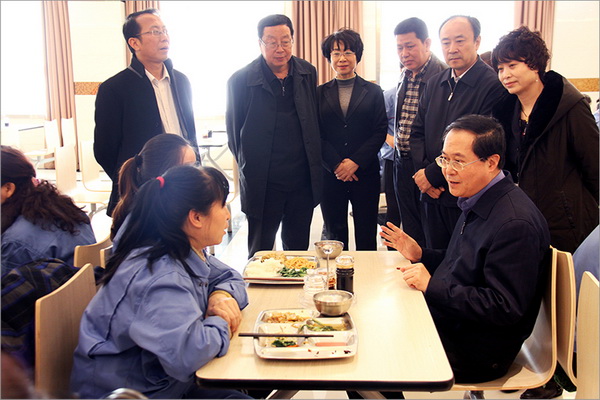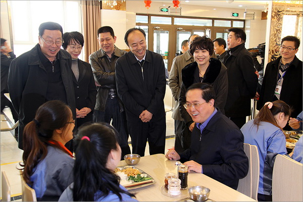 车俊一行中午来到华春毛纺AAA级工业园,在员工餐厅与员工们一起吃了工作餐,并与员工进行亲切交谈,了解员工在这里工作与生活情况,得知员工是当地人员,并在华春这个平台上工作顺利、技能长进而感到欣慰。