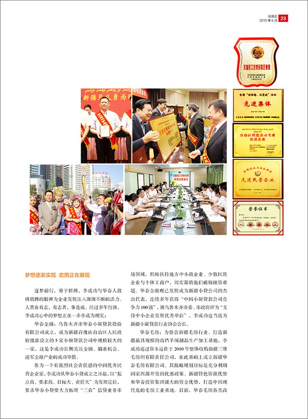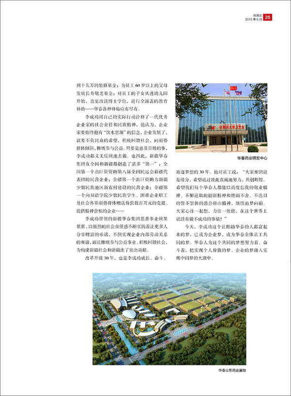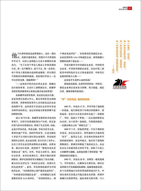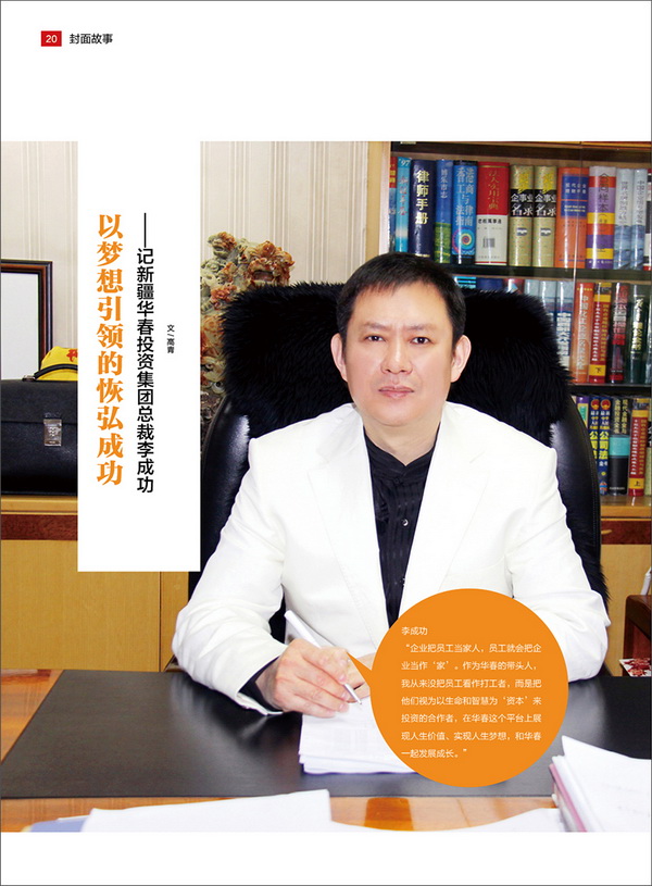 新疆华春投资集团董事局主席兼总裁李成功先生,荣登自治区工商联主办的刊物《丝路志》封面人物,并同期刊登了报告文学《以梦想引领的恢弘成功》。