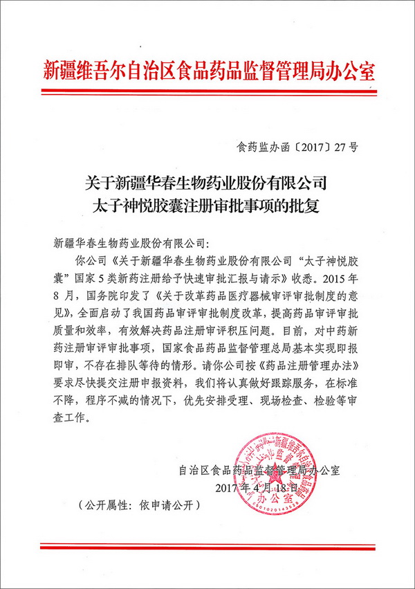 日前,自治区药监局对新疆华春生物药业股份有限公司关于抗抑郁新药太子神悦胶囊注册审批事项作出批复:国家食品药品监督管理总局基本实现即报即审,不存在排队等待的情形。请你公司按《药品注册管理办法》要求尽快提交注册申报资料,我们将认真做好跟踪服务,在标准不降,程序不减的情况下,优先安排受理、现场检查、检验等审查工作。