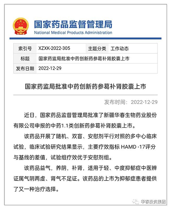 2022年12月29日,这是全疆全国医药界值得庆贺的重大喜庆日子!新疆华春生物药业股份有限公司(以下简称:华春药业)向国家药监局申报的国家十三五“国家重大新药创制·科技重大专项”抗抑郁症 1.1类中药创新药“参葛补肾胶囊”获批上市!这是全国医药界可喜可贺的盛事!更是新疆医药界国家1类创新药!开创了新疆拥有国家1类创新药的新纪元!