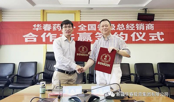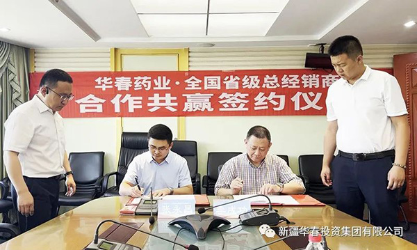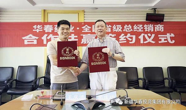 新疆华春生物药业股份有限公司(简称华春生物药业)与第二批全国省级总经销商合作协议签署仪式,于8月24日在新疆华春投资集团举行。新疆华春投资集团董事局主席兼总裁、华春生物药业董事长李成功先生,分别与江苏龘龙医药科技有限公司研发负责人张永昌(江苏省代)、北京麦尔信康科技发展有限公司总经理王庆进(北京省代)、河北思平生物医药科技有限公司总经理高春雨(河北省代),签订了《“参葛补肾胶囊”推广服务协议暨省级总经销协议》。华春生物药业相关技术与管理人员参加签署仪式。