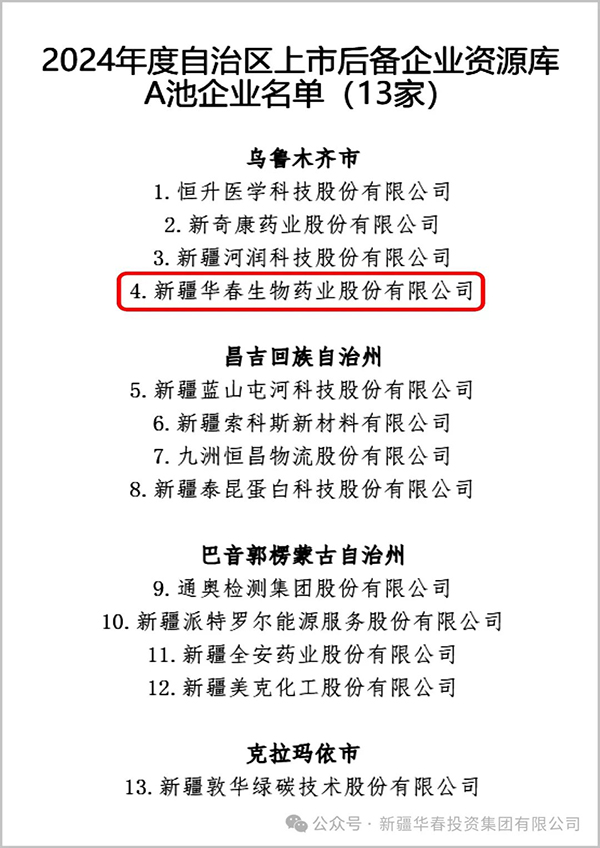 为优化充实新疆上市资源,提升自治区上市后备企业资源库整体质量,培育更多优质企业赴多层次资本市场上市挂牌和融资,让实体企业更好地参与和服务建设自治区“八大产业集群”,3月4日,自治区地方金融管理局公示了2024年度入库上市后备企业名单,新疆华春生物药业股份有限公司(简称华春药业)又被列入后备企业资源库A池。