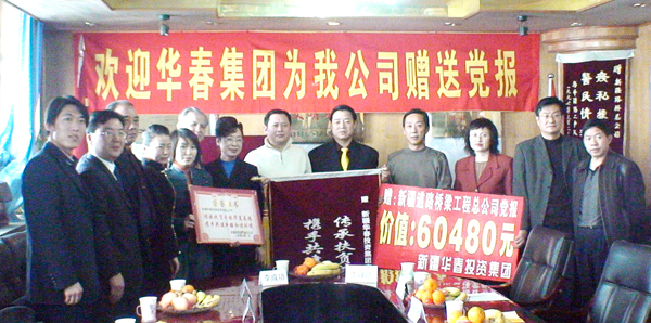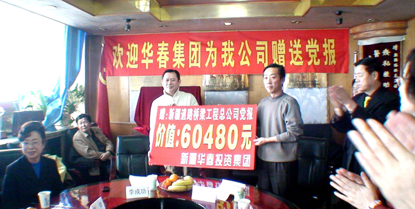 新疆华春投资集团董事局主席兼总裁李成功先生向道路桥梁工程总公司赠送价值60480元的党报