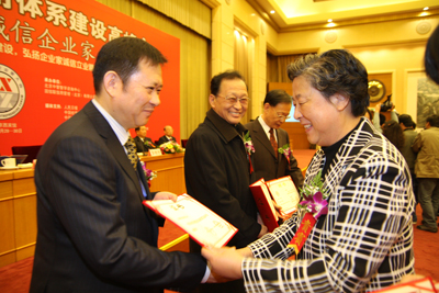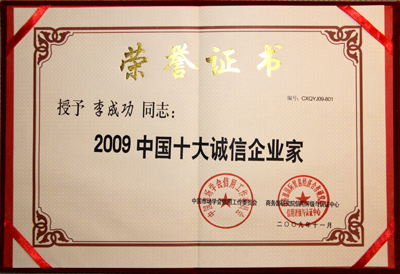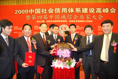 “企业信用评价AAA①级诚信企业”和“2009中国十大诚信企业家”奖项,是商务部研究院信用评级与认证中心依据国家有关法律法规,按照一定程序,集企业的债权债务管理、合同履行、公共记录以及财务等信息,通过企业诚信评价模型进行科学评估出来的,旨在区分良莠、奖优罚劣,为我国企业参与国内外市场竞争创造必要的信用条件。信用等级由低向高依次为A级、AA级、AAA级、AAA①级。对信用等级达到A级以上的企业,商务部都要在国家级权威媒体上进行公示。