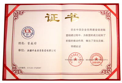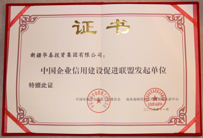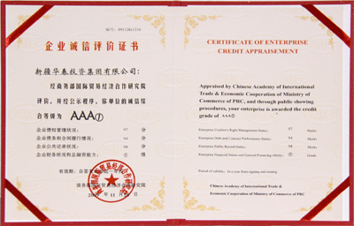华春投资集团被评为最高信用等级即AAA①级的诚信企业,颁发了信用等级证书,并出具了信用等级评估报告。同时,华春投资集团被商务部研究院信用评级与认证中心定为中国企业信用建设促进联盟发起单位,总裁李成功先生被定为中国企业信用建设促进联盟发起个人。