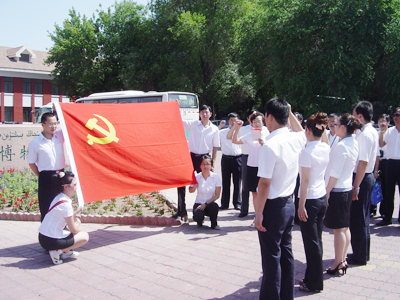 “我志愿加入中国共产党……为共产主义奋斗终身,随时准备为党和人民牺牲一切,永不叛党”。这是新疆华春投资集团党委于6月19日组织党员赴石河子参观军垦博物馆和周恩来纪念馆时,面对鲜红的党旗,预备党员进行了庄严的入党宣誓,老党员们怀着激动的心情重温了入党誓词。