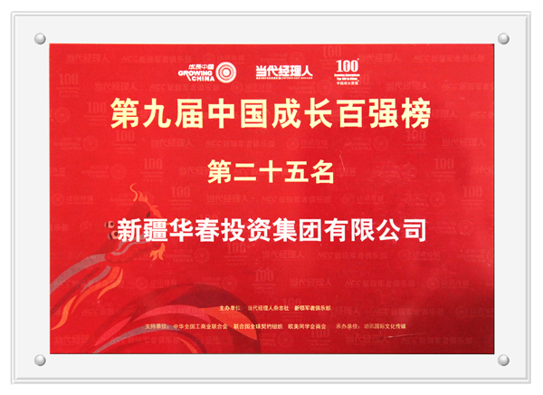 由《当代经理人》杂志社和新领军者俱乐部主办、全国工商联、欧美同学会商会、联合国全球契约组织等联合协办的第十三届成长中国高峰年会暨2010中国成长百强颁奖盛典,于12月4日~5日在北京隆重举行,新疆华春投资集团入选“2010中国成长百强”前25名、董事长兼总裁李成功先生荣获“2010年度新领军人物”称号。