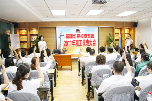 新疆华春投资集团有限公司职工代表大会于2011年6月11日上午在华春集团恒润公司培训室召开。51位参会的职工代表,肩负着集团与各子公司的430多名员工的重托,对“三项集体合同”即集体合同、工资集体协商合同和女职工权益保护专项集体合同草案进行了审议,经大会讨论和民主表决,“三项集体合同”草案获得通过,并形成职工代表大会决议书。