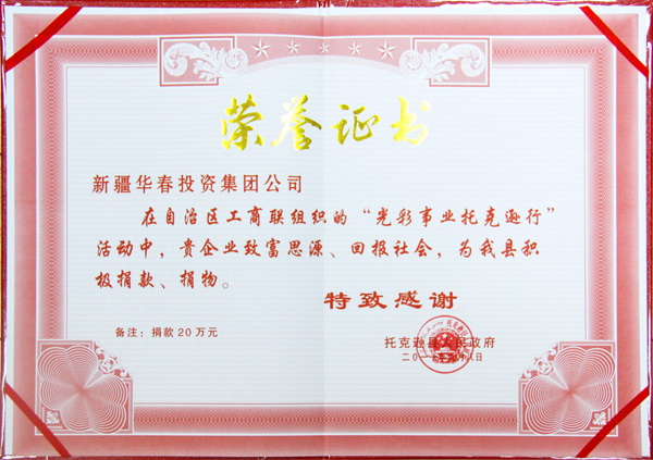 此次捐赠款项用于解决托克逊县农牧民困难群众生产资金周转和贫困家庭子女上学等问题。华春集团以企业的社会责任感,历来重视扶贫事业,积极参与光彩事业,回馈社会,为构建和谐新疆做出了民营企业的一份贡献。