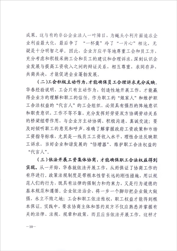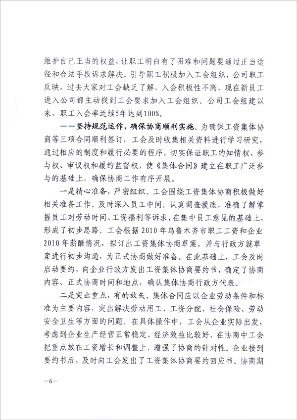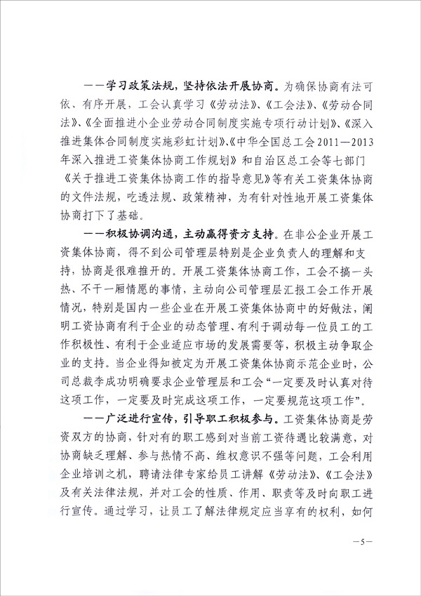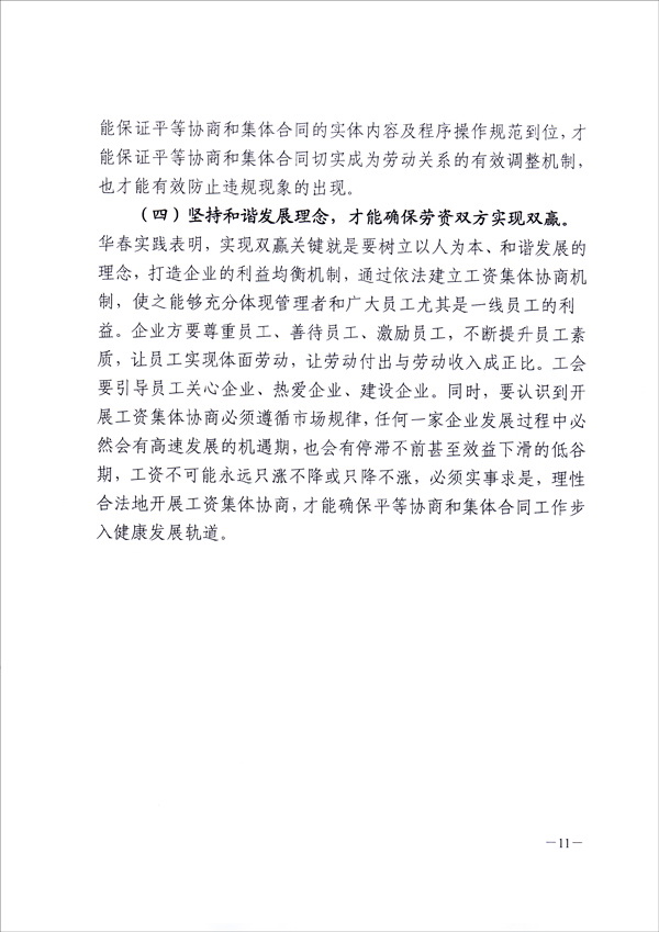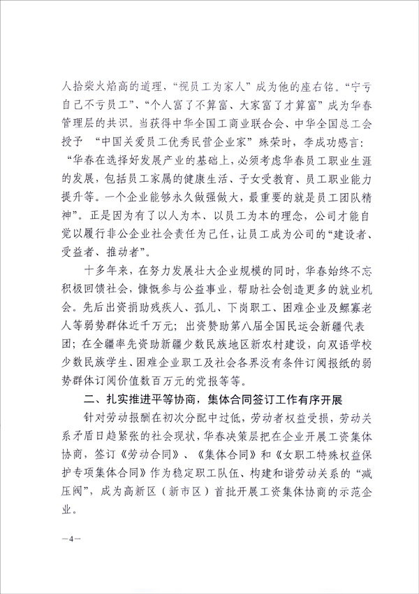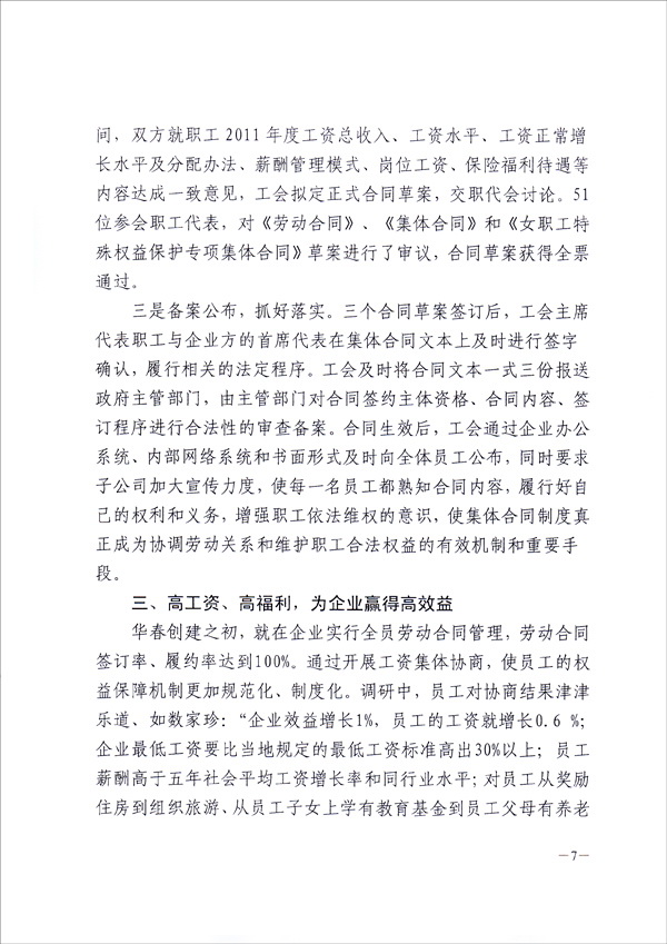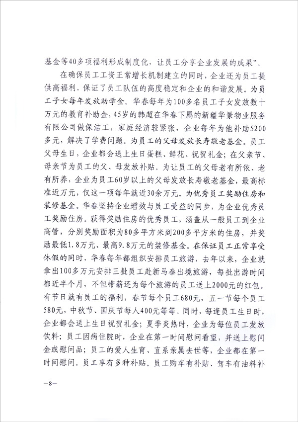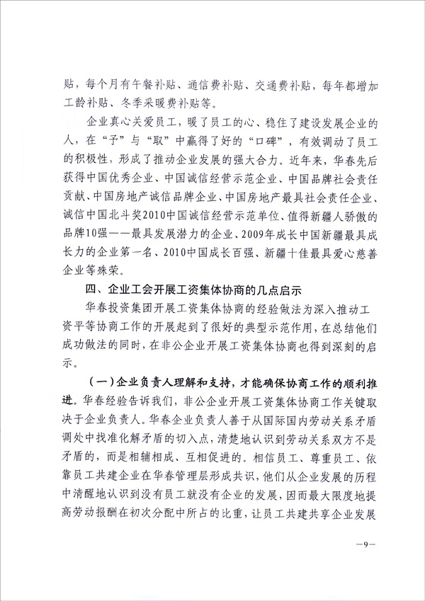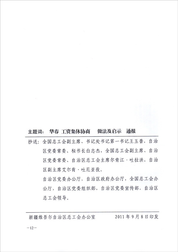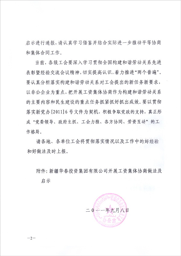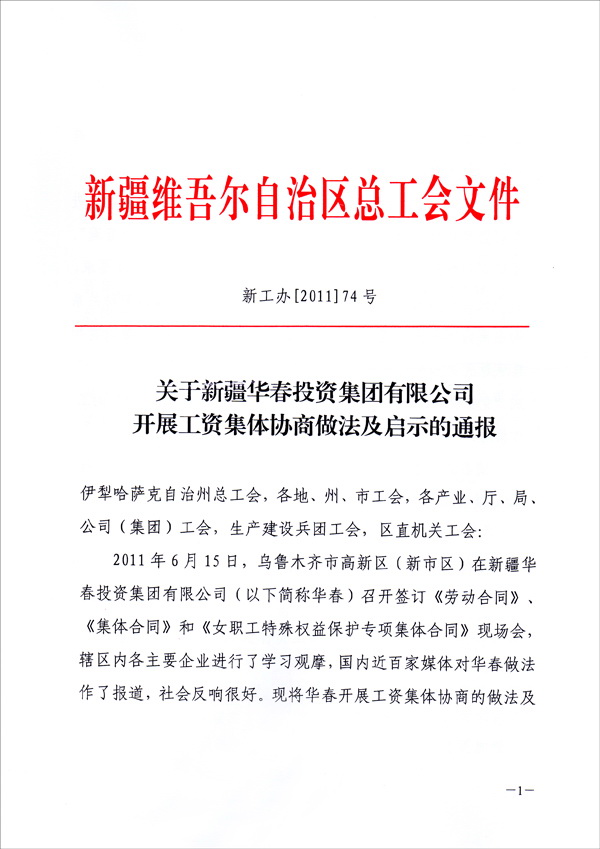 为在全疆推进工资集体协商、构建和谐劳动关系,新疆维吾尔自治区总工会于9月8日向全疆各地州、各产业、厅、局、公司集团、生产建设兵团、区直属机关工会,正式下发了长达十几页的“关于新疆华春投资集团有限公司开展工资集体协商做法及启示的通报”的红头文件,要求全疆认真学习与借鉴。
