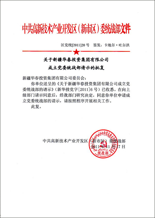 11月17日下午,新疆华春投资集团党委书记严天利,怀着激动的心情从高新区(新市区)委统战部接过批复,同意华春集团成立党委统战部,请按照秩序开展相关工作,至此,标志着非公有制企业统战工作全面开始。