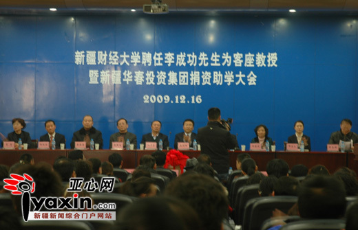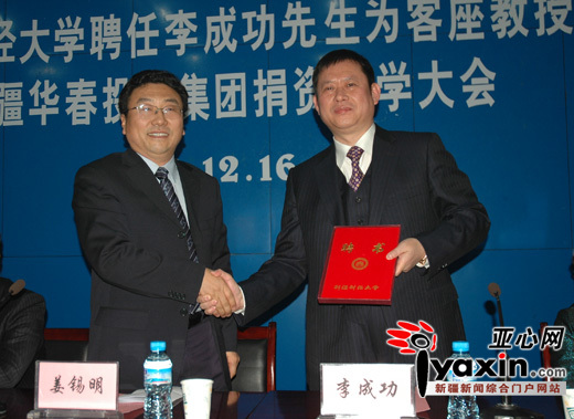 亚心网iyaxin.com讯(本网记者 邱鸣)12月16日下午,新疆华春投资集团董事局主席兼总裁李成功接受了新疆财经大学副校长姜锡明颁发的聘书,成为新疆财经大学客座教授。