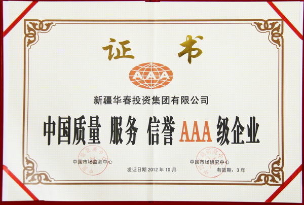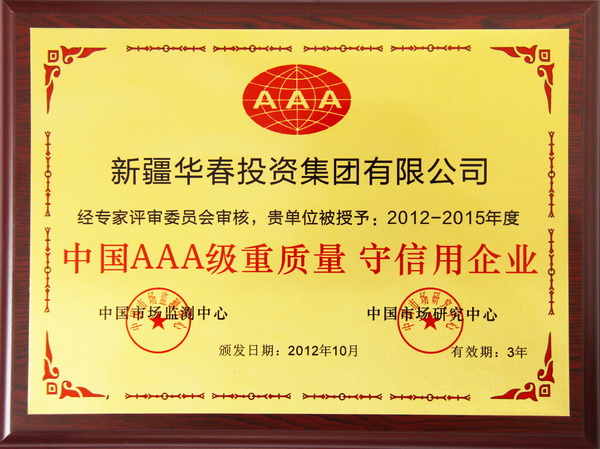 2012年12月,经中国市场监测中心、中国市场研究中心对新疆华春投资集团进行综合考证和量化分析,华春投资集团荣膺“中国AAA级重质量守信用企业”、“中国质量 服务 信誉AAA级企业”、“中国质量 服务 信誉AAA级品牌”荣誉称号,颁发了荣誉证书和奖牌。
