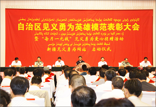 “总有一种力量让我们热泪盈眶,总有一种精神让我们格外振奋!总有一种感动让我们持久难忘。”自治区党委副书记、自治区主席、自治区综治委主任努尔•白克力出席解读了此次表彰大会的深层涵义:通过弘扬见义勇为精神,激发人民群众共建平安,引领积极向上的社会风尚,就是把中华民族的核心精神和优秀文化发扬光大。就会为凝聚民族合力,推进中华民族伟大复兴的“中国梦”,全面建成小康社会创造有利条件。努尔•白克力说:今天受表彰的3名见义勇为英雄、2个见义勇为英雄群体和13个为自治区见义勇为事业作出突出贡献的模范单位、个人就是他们中的杰出代表。他们是新疆各族人民群众的优秀儿女,是我们时代的百姓英雄和社会楷模!