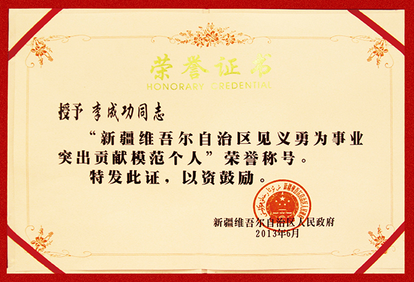 6月18日,自治区隆重召开见义勇为英雄模范表彰大会,新疆华春投资集团总裁李成功被授予为自治区见义勇为事业作出突出贡献的模范,与3名见义勇为英雄、2个见义勇为英雄群体和13个为自治区见义勇为事业作出突出贡献的模范单位与个人,受到表彰奖励。