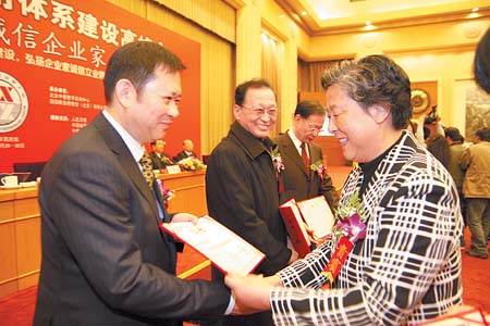 全国政协副主席张榕明给新疆华春投资集团董事局主席兼总裁李成功(左)颁发“中国十大诚信企业家”奖章证书。(图片由采访对象提供)