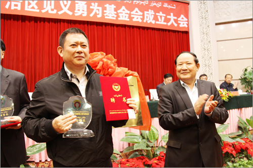 自治区见义勇为基金会成立大会于2012年10月19日上午在新疆人民会堂多功能厅隆重举行,新疆华春投资集团董事局主席兼总裁李成功先生当选自治区见义勇为基金会首届理事会副理事长,自治区副主席、政法委副书记贾帕尔•阿比布拉为李总裁颁发了副理事长证书和座牌。