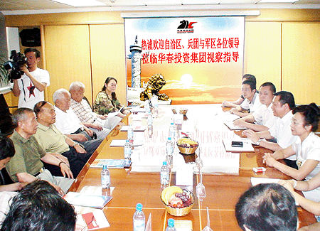 6月5日上午,新疆国际国内公共关系协会考察团前往中国优秀企业——新疆华春投资集团进行考察、调研。考察团由自治区党委原副书记张思学、原兰州军区副政委、新疆军区政委唐广才、新疆生产建设兵团原政委郭刚、新疆生产建设兵团原司令员刘双全和自治区招商发展局武茂雄处长组成。