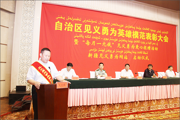 李成功总裁代表为自治区见义勇为事业作出突出贡献的模范单位和个人在表彰大会上发言。他怀着感恩之情说:“我们只是做了一点力所能及的事,自治区人民政府给予了我们这么高的荣誉,民营企业的发展,得益于党的好政策、得益于和谐安定的社会环境。而正是这些见义勇为的英雄们,为今天和谐安定的社会,献出了他们的鲜血和生命,使我们企业有了优美的发展环境,饮水思源,我们要把对见义勇为英雄们的敬仰之情,转化为弘扬正气、凝聚正能量、构建和谐社会的强大动力。企业要积极参与支持见义勇为事业、并回报社会,这是所有民营企业家义不容辞的社会责任!希望有更多的民营企业家和社会有识之士,以勇于担当的时代精神,积极投身于见义勇为事业,慷慨解囊,用实际行动真诚关心、爱护见义勇为者,决不让为社会安定、人民幸福而流血的见义勇为英雄们流血又流泪、伤身又伤心。形成全社会都来关心、支持见义勇为事业、弘扬见义勇为精神的良好局面,为新疆的跨越式发展和长治久安做出应有的贡献!让我们携起手来,共同激发起全社会的正能量,弘扬正气,为正义之火添柴加薪!