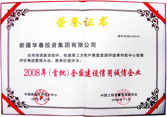 “2008年首批全国建设信用诚信企业”荣誉证书