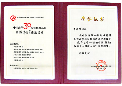 旨在关注改革进程、展示改革成就、聚焦改革之星、弘扬改革业绩,由中国改革报社、国务院国有资产监督管理委员会研究中心、国家发展和改革委员会中国经贸导刊杂志社、人民日报社中国经济周刊、经济日报中国经济信息杂志社及中国企业报社六家机构特联合主办的中国改革开放30周年成就巡礼暨改革之星颁奖典礼,于11月6日下午在庄严的北京人民大会堂隆重举行。新疆华春投资集团董事局主席兼总裁李成功先生荣获“改革之星——影响中国(行业)改革十大创新人物”奖项。